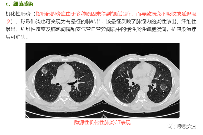 肺隐球菌病:下图。肺隐球菌病的影像学表现多种多样,缺乏尤特异性。免疫功能正常者常使病灶局限形成肉芽肿结节,因此胸部 CT常见表现为单发或多发的结节肿块影,直径大小不等,边界清楚,可有分叶及毛刺,容易误诊为肺癌和肺转移瘤。其次还可表现为斑片浸润影、实变影和偏心后壁空洞。病灶多位于中下肺野外带分布,可伴有支气管充气征、晕征 。