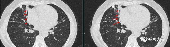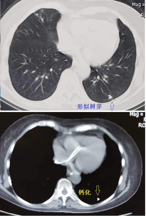 从肺窗看到树芽征,要看纵隔窗,有时候是无意义的钙化,见图2。