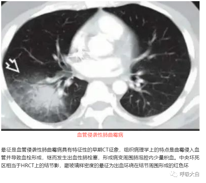 晕征是指肺部CT上表现为围绕结节或肿块周围的略低于肿块密度而又高于肺实质密度的环形磨玻璃影。晕征最早用于描述局灶性侵袭性曲霉菌病灶周围出血的征象,被认为是肺部真菌感染的特异性影像表现。晕征中磨玻璃样影通常和结节出血相关,这些结节出血的机制包括:出血性梗死、血管炎、支气管动脉瘘以及坏死等。当然了,磨玻璃影还可以由肿瘤或炎症浸润周围肺组织造成。