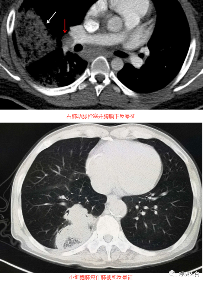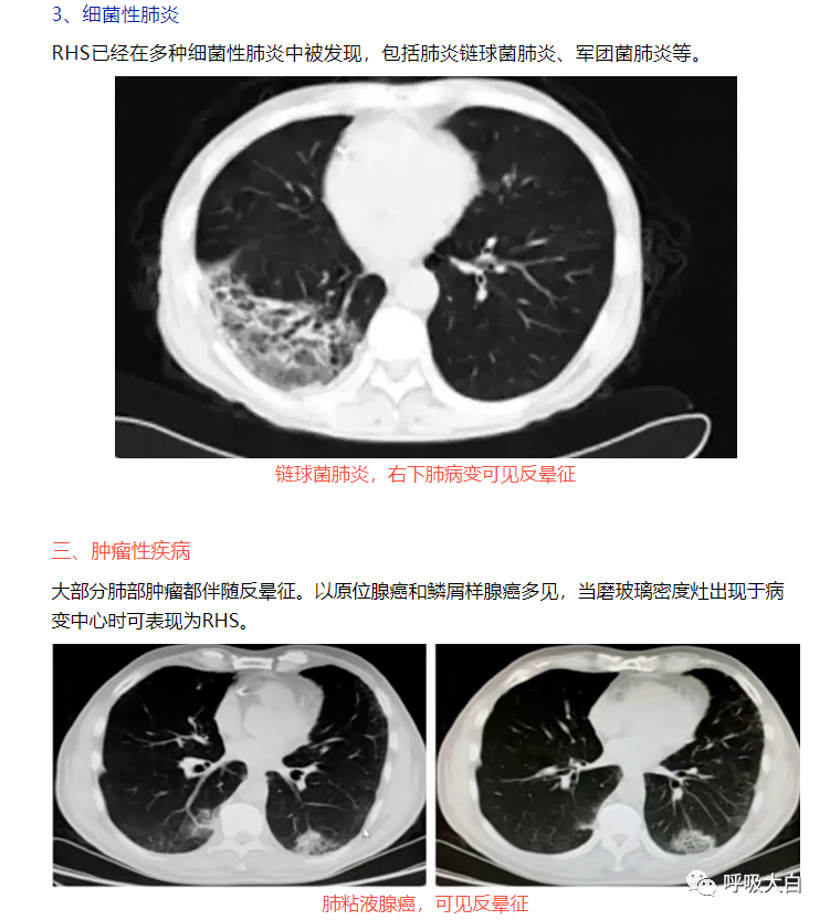 反晕征是一种特殊的胸部 CT征象,表现为环状高密度影围绕着中央密度较低的肺部阴影。起初认为,反晕征为隐源性机化性肺炎的特征性的征象;但此后被报道见于多种其他疾病,如肺副球孢子菌病、肺淋巴瘤样肉芽肿病、肺结节病、侵袭性肺真菌病、活动性肺结核及肉芽肿性多血管炎( 原韦格纳肉芽肿),亦可见于继发于感染或胶原血管病的机化性肺炎。