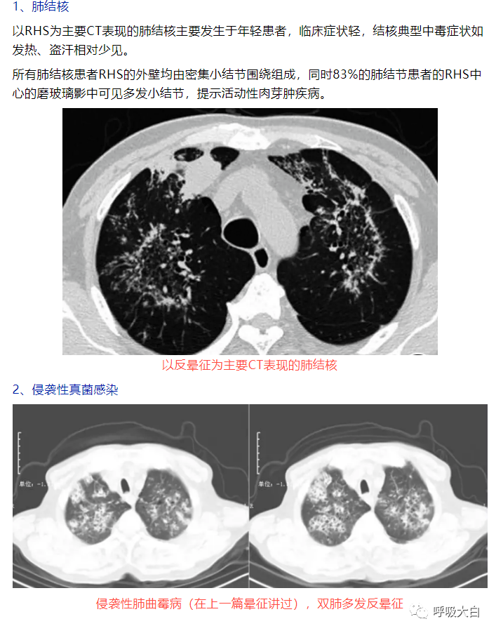 在隐源性机化性肺炎,反晕征中央的磨玻璃影的病理基础是肺泡间隔的炎症和细胞脱屑及少量终末气腔内的肉芽组织, 而外周的环状高密度影则对应远端气腔( 细支气管、肺泡管、肺泡腔) 内的纤维机化。表现为反晕征的结节病,外周的环状高密度影对应着多发的肉芽肿。肺隐球菌病则对应着肉芽肿性炎,PAS 染色可见着红色荚膜的隐球菌。肺结核的 CT环状高密度影对应的病理是上皮样肉芽肿,伴或不伴干酪样坏死,抗酸染色阳性或阴性。